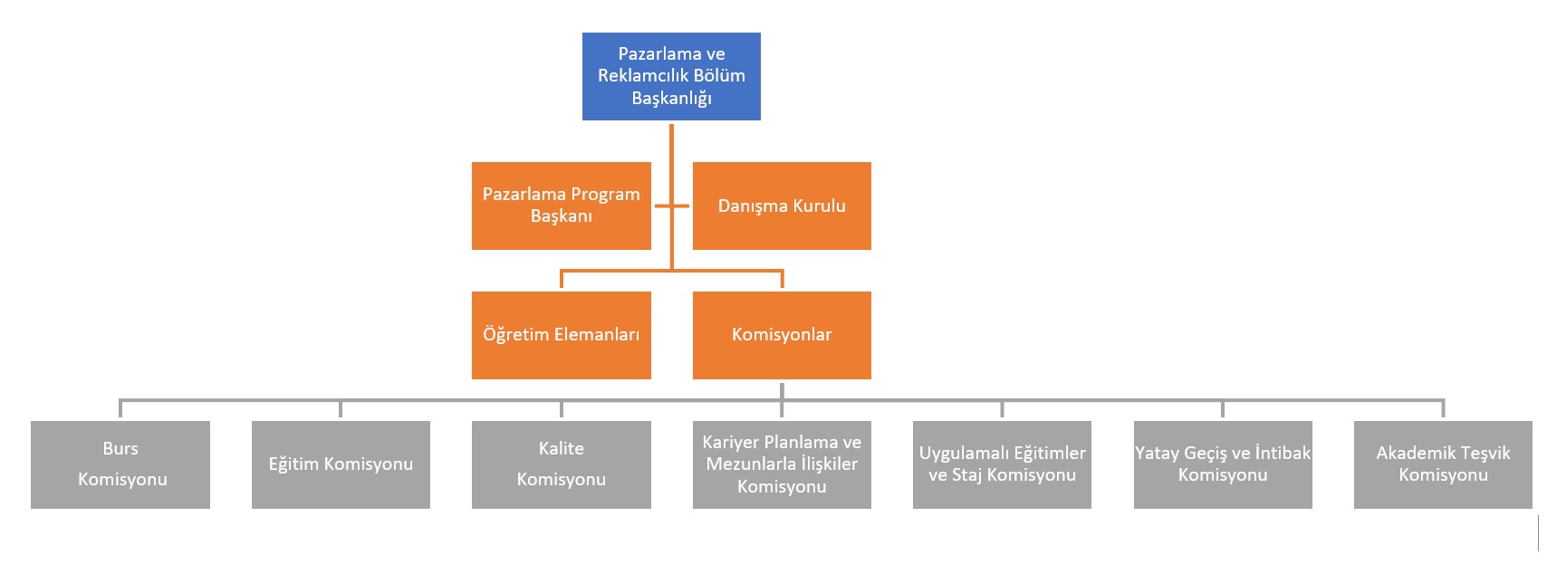 | Bölüm Hakkında: Pazarlama ve Reklamcılık Bölümü, bünyesinde Pazarlama örgün öğretim programını barındırmaktadır. Bölüm; tüketici davranışı, satış teknikleri, pazarlama ilkeleri ve yönetimi, reklam, marka yönetimi, pazarlama araştırması, iş İngilizcesi gibi pazarlama alanındaki temel dersler üzerine kuruludur. Bu temel dersleri pazarlama mevzuatı, halkla ilişkiler, tedarik zinciri yönetimi, sunuş teknikleri, küresel pazarlama, gönüllülük çalışmaları gibi yan alanlar tamamlamaktadır. Derslerin önemli bir bölümü uygulamalı olarak verilmektedir. Bu sayede öğrenciler teorik olarak edindikleri bilgileri pratikte uygulamaktadır. Bunu destekleyecek şekilde öğrencilerin 40 iş günü zorunlu staj yapmaları gerekmektedir. Öğrenciler, ilgi alanları ve kariyer planları doğrultusunda bölümün farklı alanlarından seçmeli dersler alırlar. Aynı zamanda diğer bölümlerden ders alarak kişisel gelişimlerine destek olabilirler. Bölüm, düzenlediği çeşitli akademik ve bilimsel toplantılar, sektör temsilcileriyle söyleşiler, kariyer günleri, şirket gezileri, sosyal aktiviteler gibi etkinlikler ile öğrencilerin gerek akademik gerekse sosyal becerilerine katkı sağlayacak fırsatlar sunmaktadır. Bölüm mezunları pek çok sektörde farklı pozisyonlarda çalışmakla birlikte özellikle otomotiv, giyim, gıda ve ilaç sektörlerinde satış elemanı ve yöneticisi olarak kariyer yapmaktadır. PAZARLAMA VE REKLAMCILIK BÖLÜMÜ ORGANİZASYON ŞEMASI |